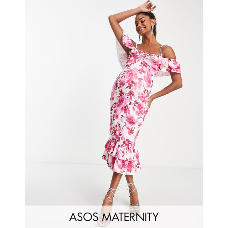 Asos Design Maternity Ruffle Midi Dress In Pink Floral Print Asos